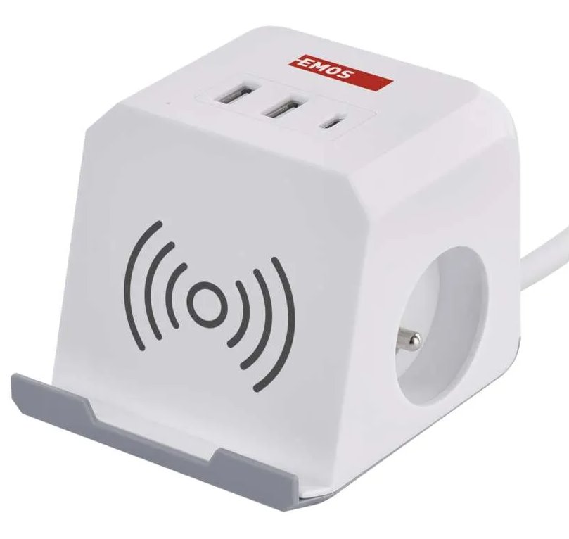 Prodlužovací kabel - kostka 2 m / 2 zásuvky / bílý / 2×USB-A + 1×USB-C+Qi / 1,5 mm2