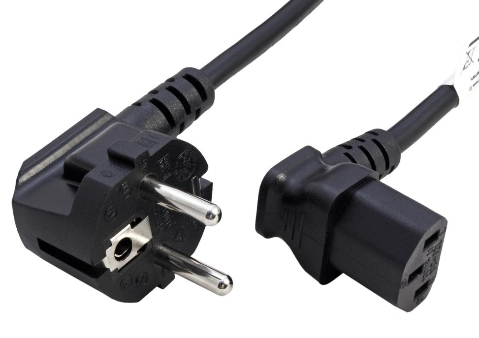 Pokud potřebujete zapojit zařízení k rozvodné síti se zásuvkou typu E nebo F (CZ, FR DE), použijte tento kabel. Na zařízení (standardní počítače, UPS…) musí být osazeny konektory IEC320 C14 (lichoběžník se svislými kontakty). Přístrojový konektor je lomený o 90° pro úsporu místa za připojeným zařízením.