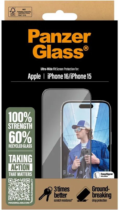 PanzerGlass® Ultra-Wide Fit Apple iPhone 16/15 s instalačním rámečkem