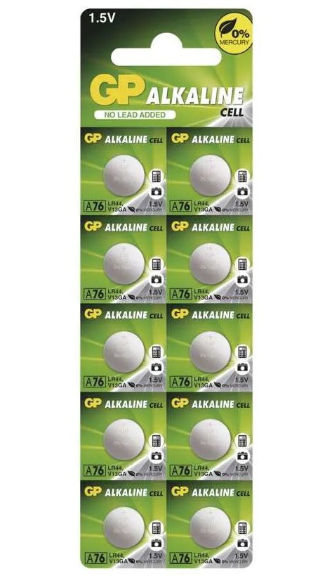 Alkalická knoflíková baterie GP A76F (LR44) napětí 1,5 V typ GP A76F (AG13, LR44, LR1154, V13GA, PX76A) provozní teplota 0 °C až +45 °C počet nabíjecích cyklů nenabíjecí hmotnost 1,7 g max. skladovatelnost 3 roky rozměr 11,6 × 5,4 mm