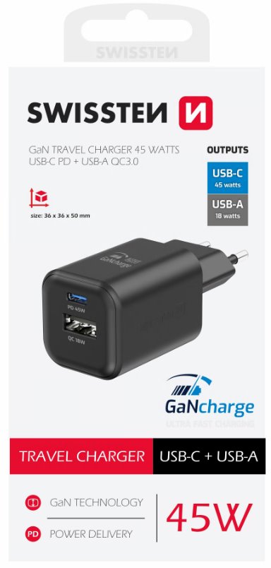 Hledáte kvalitní a rychlou nabíječku, která Vaše zařízení nabije za velmi krátkou dobu? Našli jste správně. Nabíječka Swissten o výkonu 45W hravě zvládne i notebooky s nižším vstupním výkonem, kdy veškerá mobilní zařízení nabijete rychle bez jakýchkoliv problémů. Díky rychlonabíjecím protokolům Power Delivery a PPS (Programmable Power Supply) ušetříte spoustu času stráveného čekáním na dobití.