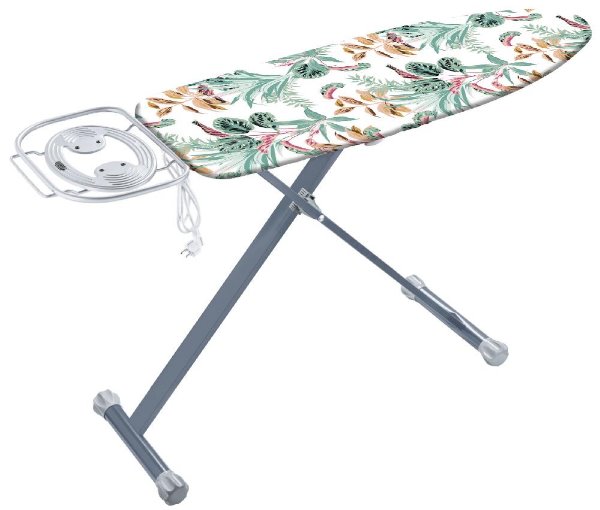 Žehlící prkno s žehlící plochou odvádějící páru a elektrickou zásuvkou, opatřeno transportním zámkem, má stabilní a bezpečnou konstrukci opatřenou protiskluzovými koncovkami na nohou, součástí je také bavlněný potah, nastavitelná výška do 90 cm s odkládací plochou pro napařovací žehličky se silikonovými prvky proti poškození plochy,