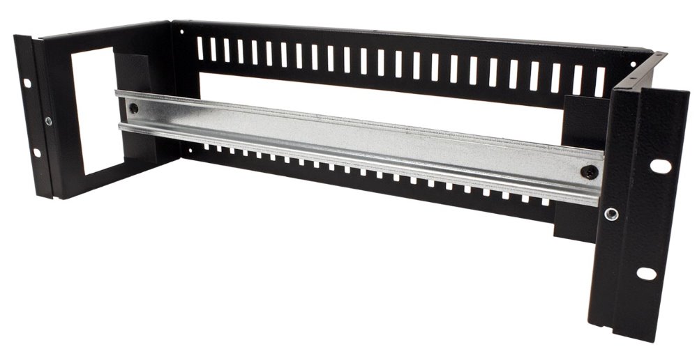 DIN lišta do 19" rozvaděče v držáku s výškou 3U.