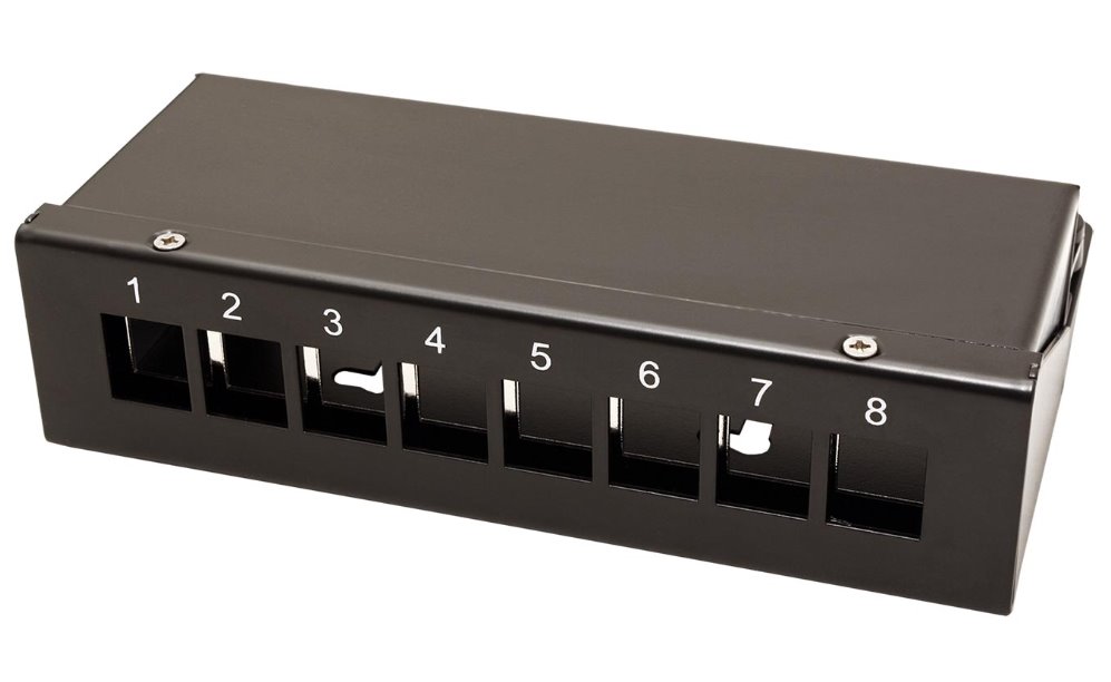 Stíněný, 8-portový patchpanel určený pro montáž na stěnu (výška 1U).