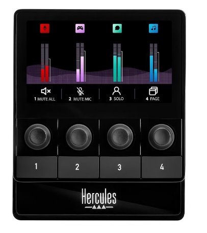 OVLÁDÁNÍ : 4 enkodéry, 4 akční tlačítka, tlačítko zapnutí/vypnutí obrazovky PŘIPOJENÍ: Windows® počítač: pomocí USB (dodáváno včetně kabelu) NAPÁJENÍ: Napájení pomocí přiloženého kabelu USB OBSAHUJE APLIKACI: HERCULES STREAM CONTROL MINIMÁLNÍ SYSTÉMOVÉ POŽADAVKY: Windows® 10 nebo výš, USB port