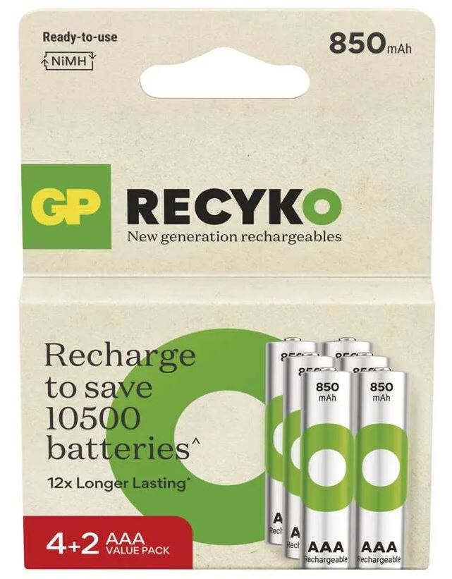 Nabíjecí baterie GP ReCyko 850 AAA (HR03) velikost baterie AAA chemické složení NiMH kategorie/řada ReCyko možnost nabíjení ano kapacita 850 mAh napětí 1,2 V typ HR03 (mikrotužka, AAA) provozní teplota -20 °C až +50 °C počet nabíjecích cyklů