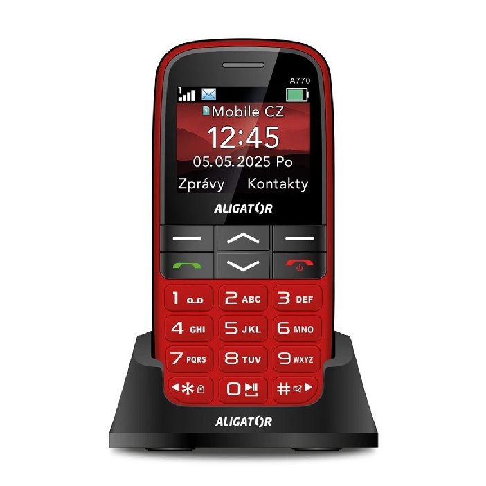 Obsah balení: Telefon Aligator A770, nabíjecí stojánek, návod k použití (bez nabíječky)