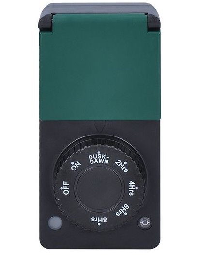 Tento analogově řízený časový spínač se soumrakovým čidlem slouží k automatickému zapínání a vypínání zařízení. Nabízí šest provozních režimů: ON, soumrakový senzor, 2 h, 4 h, 6 h a 8 h. Soumrakový senzor umožňuje ovládat zařízení podle západu a východu slunce. Pracuje s napětím 230V, maximální proud činí 16A a maximální zatížení 3600W. Má stupeň krytí IP44 a je vhodný pro provoz v teplotách od -10°C do 40°C. Černé provedení.
