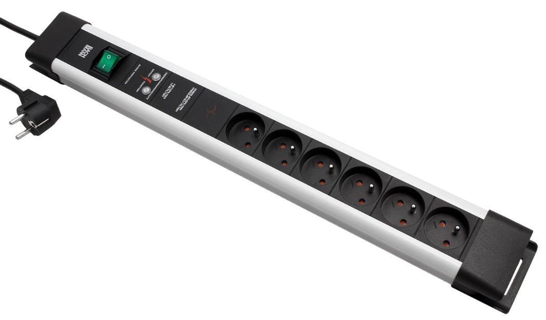 Šestinásobná zásuvka s vypínačem, přepěťovou ochranou, odrušovacím filtrem a prodlužovacím kabelem. Zásuvky typ E (české), vidlice typ E/F (univerzální pro zásuvky s ochranným kolíkem nebo bočními kontakty).