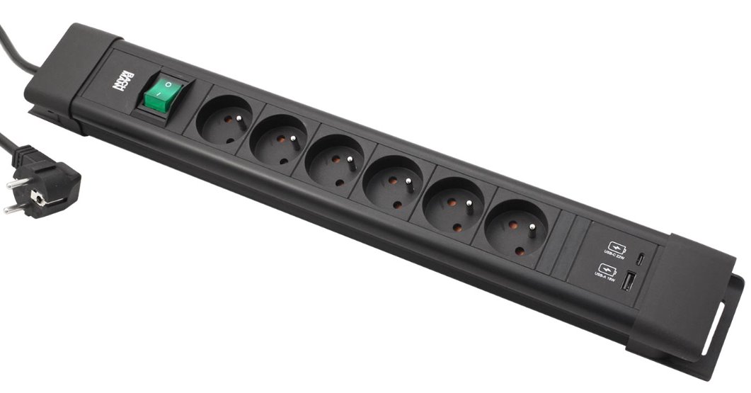 Kompaktní přípojné místo se síťovými zásuvkami s možností navinutí kabelu na tělo zásuvky a zavěšení. Obsahuje napájecí modul 22W (USB A + USB C). S vypínačem pro vypnutí všech zásuvek najednou.