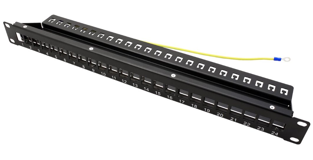 Stíněný patchpanel (možno osadit i nestíněné moduly, ale bez funkčnosti uzemnění) určený pro montáž do 19" rozvaděče. Umožňuje osadit do rozvaděče potřebné množství Keystone modulů - jednoduchá možnost přidání dalšího modulu, nebo výměny již osazeného.
