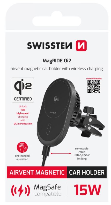 SWISSTEN MagRide je moderní držák do auta s integrovanou bezdrátovou nabíječkou, která podporuje nejnovější standard Qi2 a bez problémů nabije váš iPhone, Samsung Galaxy i další kompatibilní zařízení. Nabíjí až výkonem 15 W a díky magnetickému vystředění zajišťuje perfektní držení a maximální účinnost během jízdy. Odolné tělo, snadná instalace a chytré bezpečnostní funkce dělají z MagRidu ideálního společníka na cesty.