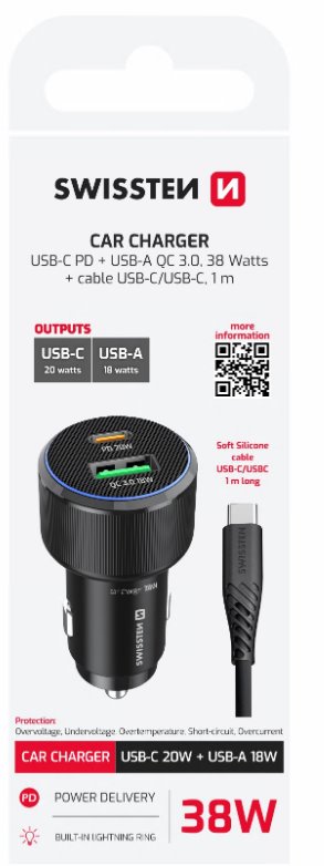 Praktická autonabíječka s podporou rychlého nabíjení PD 3.0 a QC 3.0, vybavená porty USB-C a USB-A. Součástí balení je 1m kabel USB-C/USB-C (3A, 60W, soft silicone) pro okamžité použití. Modré LED osvětlení v obvodu nabíječky usnadňuje připojení kabelu i při jízdě v noci.