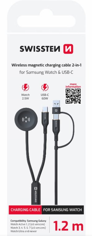 Magnetický kabel SWISSTEN 2v1 je navržen pro rychlé a pohodlné nabíjení hodinek Samsung Galaxy Watch i zařízení s konektorem USB-C. Díky odnímatelné redukci USB-A/USB-C jej lze snadno připojit k široké škále nabíječek. Při použití USB-C nabízí výkon až 60 W pro telefony, tablety nebo notebooky a až 2,5 W pro hodinky. Flexibilní silikonový kabel o délce 1,2 m je odolný, příjemný na dotek a zabraňuje zamotávání.