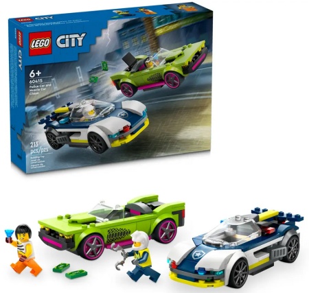 Stavebnice 60415 LEGO® City Honička policejního auta a sporťáku pro kluky i holky obsahuje prima policejní zásahový vůz a vozidlo jako stvořené proútěk. Nechybí minifigurky policisty a kriminálnice pro zábavné hraní rolí a vyprávění příběhů.
