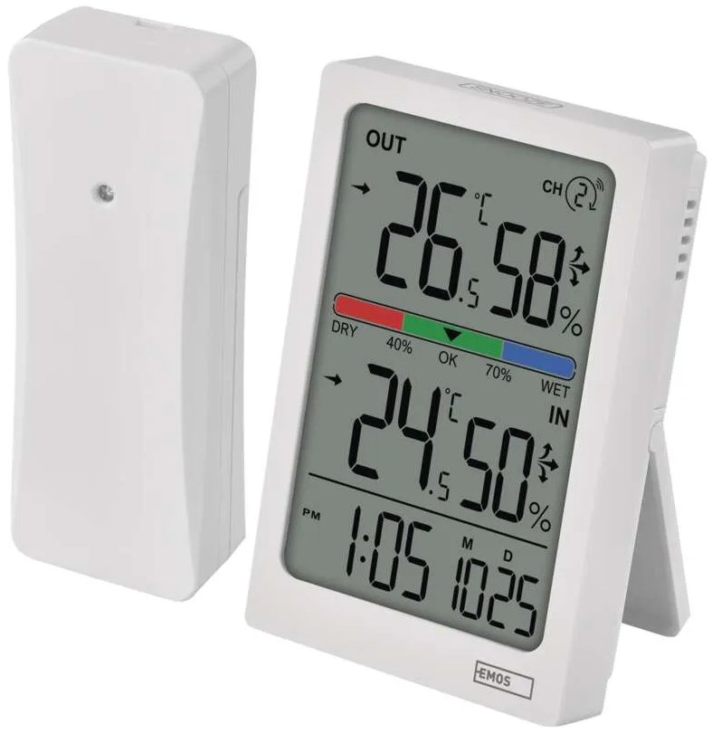 Moderní bezdrátový teploměr vám snadno ukáže, jaká je teplota uvnitř i venku s rozlišením 0,1 °C, zobrazí vnitřní i venkovní vlhkost v rozsahu 1 % až 99 % RV a nabídne také zobrazení trendu teploty nebo tříúrovňový ukazatel komfortu. S měřením venkovní teploty vám pomůže bezdrátový senzor, který lze umístit až 100 m od teploměru ve volném prostoru.