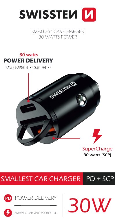 Nano autonabíječka SWISSTEN s výstupem USB-C Power Delivery a USB SuperCharge. Celkový výstupní výkon 30W. Baleno v blistru SWISSTEN.
